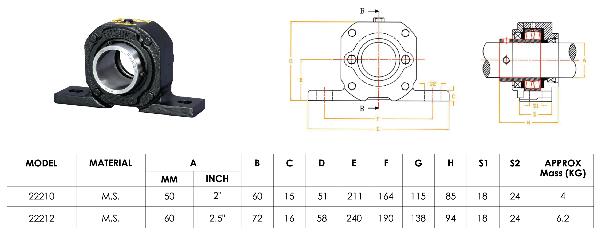 Nisuka Plummer Block - 200 Series Patented Product - Patent No - 530384 Copying of Product will take place legal action. Product Features and Benefits Housing Material - Mild Steel Special long inner Spherical roller Bearing Proper lubrication system Strong and Heavy Housing Material Durable and long life